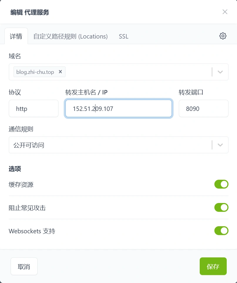 📌通过在代理服务添加反代,具体输入如下,需要将VPS IP用域名托管。